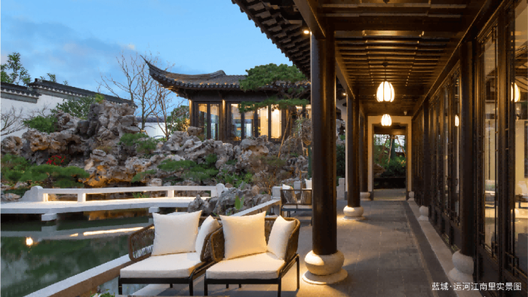 房子不只是住的地方,更是文化和审美的载体。虎丘江南里深研宋式风雅,从古画诗词中汲取灵感,把宋韵美学融入当代建筑。整个社区仿照苏州古典园林的格局来打造,有巷、有苑、有岸,一步一景,就像住进了一幅流动的山水画里,这种中式合院风格在市场上独树一帜。