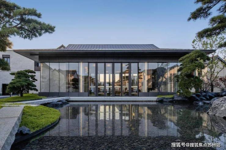 亭台影罅,楼阁虚邻。入口处建筑坡屋顶设计沿用中式传统建筑形式,庭院采用对称布局,将视线延伸至虎丘塔,中央静态水景将周围建筑映入水中,形成画卷,产生多层次空间和朦胧美感。