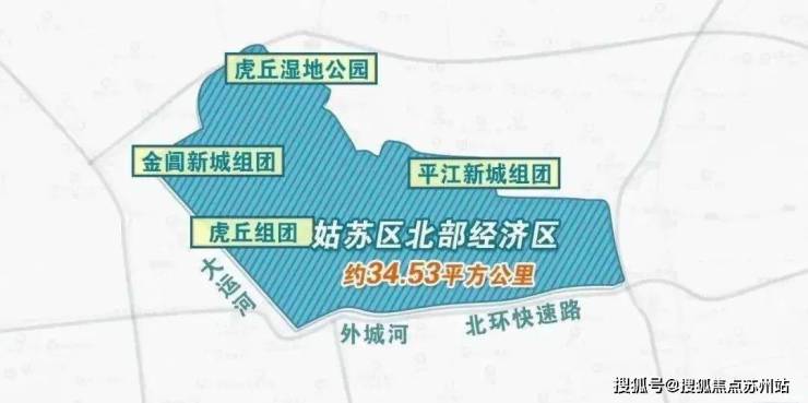 姑苏区北部经济区包括平江新城组团、金阊新城组团、虎丘组团、虎丘湿地公园等四个功能组团,总用地面积约为34.53平方公里。规划范围内囊括了虎丘山独一无二的旅游生态、虎丘湿地公园江南水乡自然生态资源,依托规划区内自然生态资源打造生态创新区,兼顾经济发展和生态保护平衡,打造代表姑苏形象的城市新地标。