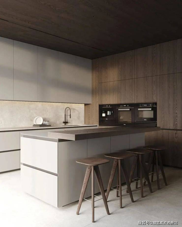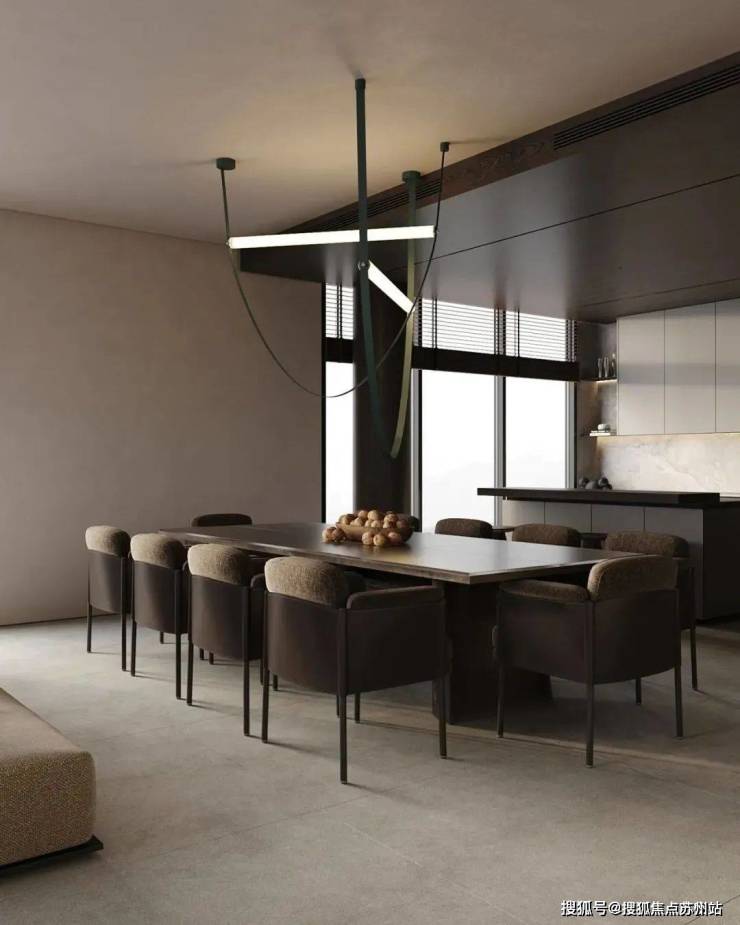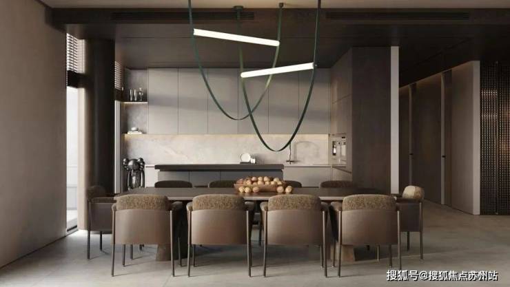 餐厅与厨房位于客厅的旁边,选用深色作为主色调,与客厅形成了对比。同时厨房做成了开放式的多功能厨房,包含了就餐、吧台与厨房功能,很好的利用了空间,兼具美观性与实用性。深色的餐桌搭配上餐椅,为屋主打造出了一个舒适的用餐空间,餐桌上方的吊灯十分吸睛,具有线条美感。