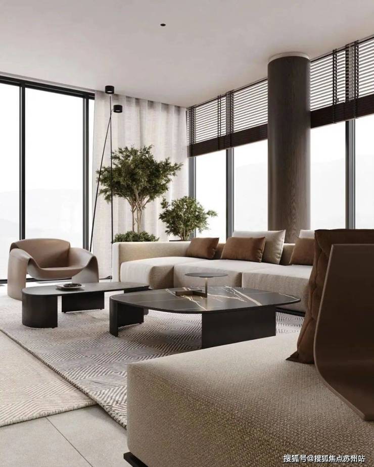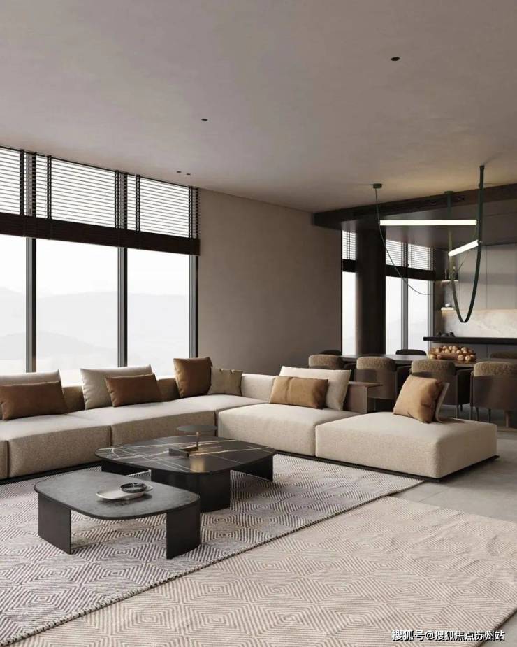 客厅中,蓝城丹枫云庐售楼处电话☎:400-882-8814(预约热线)✔✔✔设计师选用暖灰色作为空间的主色调,奠定整体沉稳的空间基调。灰白色的布艺沙发搭配上造型简洁的黑色大理石茶几,形成了色彩上的对比。大理石上细腻的纹理丰富了空间的细节,提升了整体的质感。大面的落地窗保证了室内拥有充足的光线,给人明亮的视觉感受。电视墙的设计十分简洁耐看。