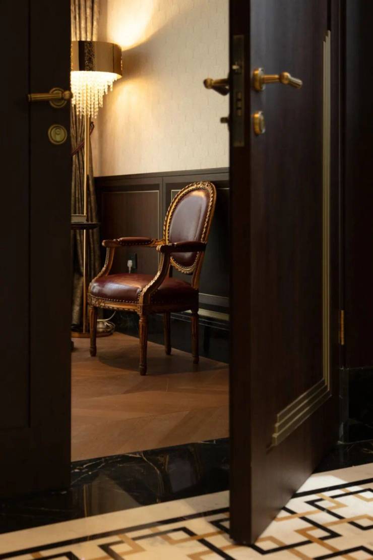 接待厅结合了恢弘的空间气韵与复古的海派奢华,典雅不失细节,大理石与金属碰撞出端庄雅致的艺术气息,赋予空间层次感,抬头可见的空间气度,精致无双。