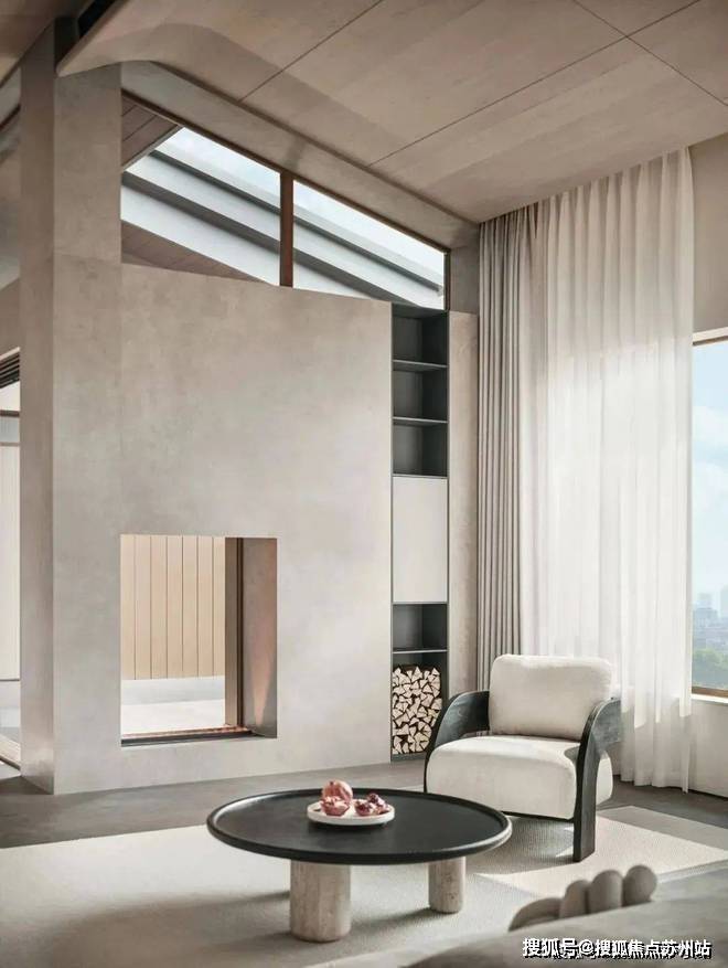 倾斜的吊顶和特意做出的错落 “断层”,增强了空间的纵深感。这种感觉不是来自单一方向,而是四面八方的张力共同形成的。