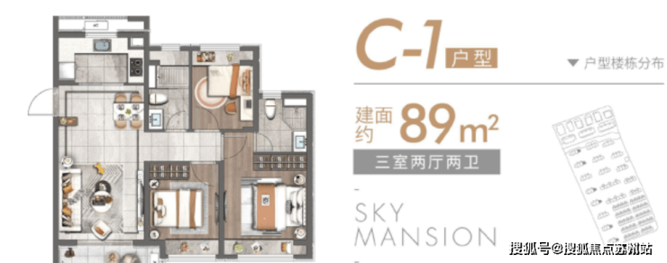 户型:3房2厅,面积在83㎡到89㎡