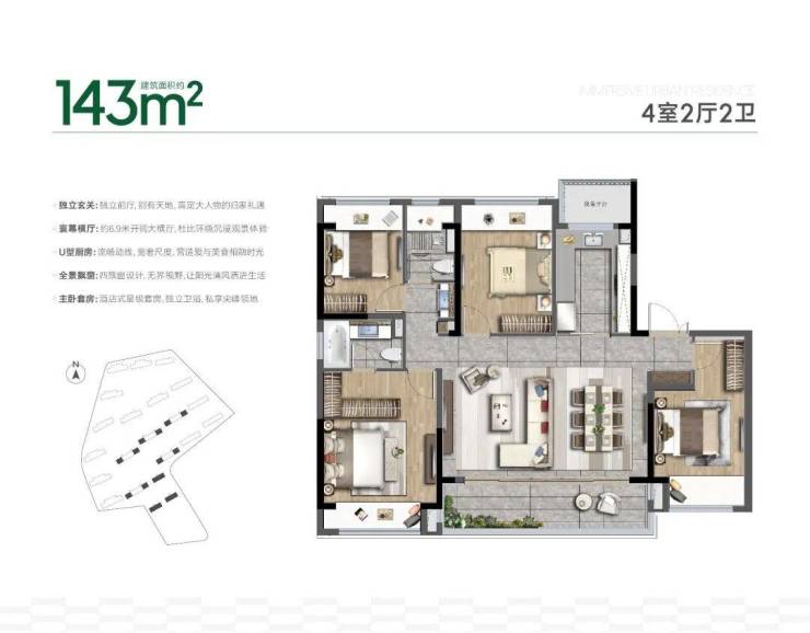 户型鉴赏 建面约105-143㎡的精装改善户型,设计方正,空间利用率高,满足二胎家庭或三代同堂的居住需求。