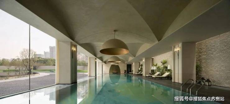 泳池在几何关系中得到了构建,层层叠叠的拱形吊顶拼接,对侧的落地窗映射室外的开阔景观,石质的肌理进行还原表达,分别从视觉与触感上映射自然主义。