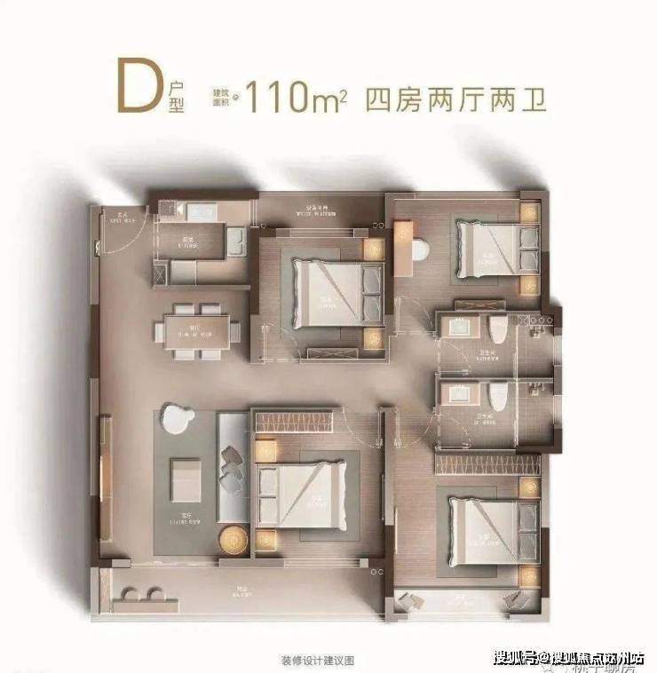 建筑面积约110㎡均为边套户型,纵享丰富观景视野,四房两厅两卫设计并蓄尺度感与尊崇感。