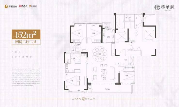 152㎡和156㎡的户型几乎一样,都是2梯2户设计,三开间朝南,整体面宽约12.85m,客厅尺度也很大,约5.75米。