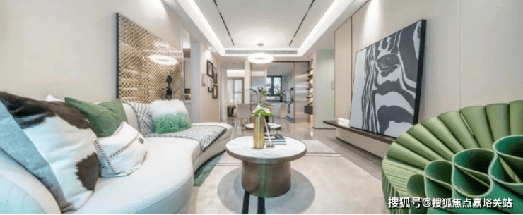 客厅和主卧都标配悬浮吊顶、无主灯设计,背景墙采用皮革和铝合金拼接,也都是实体交付的.