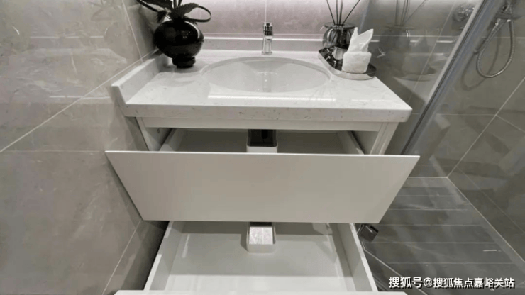 卫生间洗手池下的空间向来是卫生死角,还有弯曲的水管绕来绕去.项目却别出心裁地将这个死角做成了储物柜,充分利用空间.