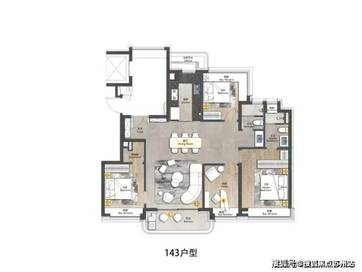 四开间朝南的设计+六飘窗(北次卧约270°转角飘窗)+宽面阳台,整个户型的采光通透度真的做到了完美。