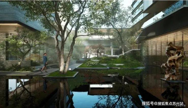 依凭半岛三面水岸的天然资源,以“一堤三面湖”和“水街襟两园”设计笔触,实现滨水互动、开门见水的场景体验;融汇吴门画派、苏州园林造园理念,营造出一座温润如玉的流动庭园。