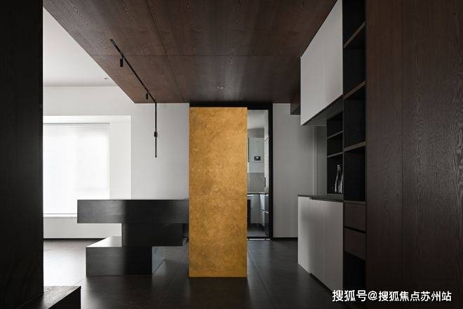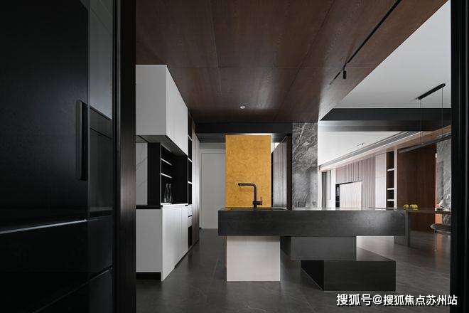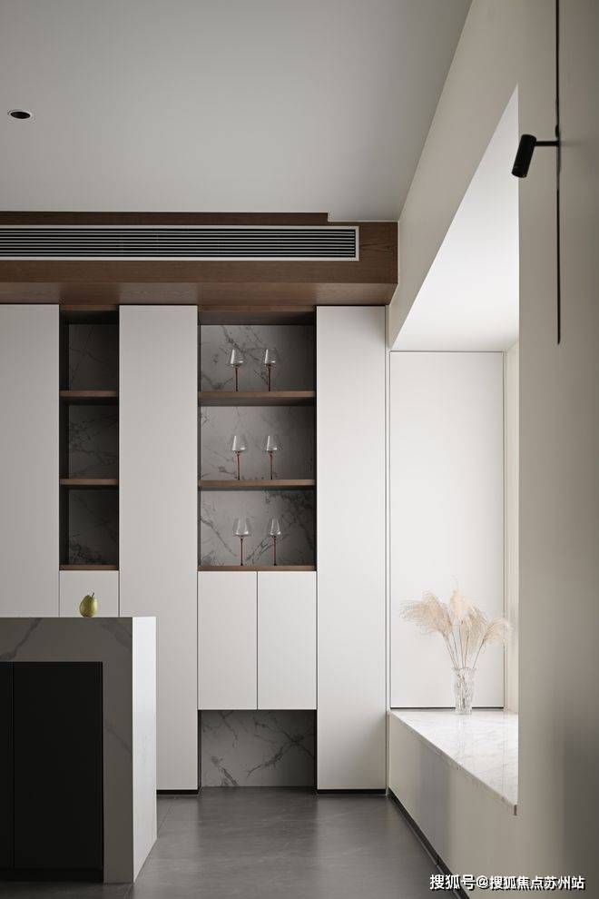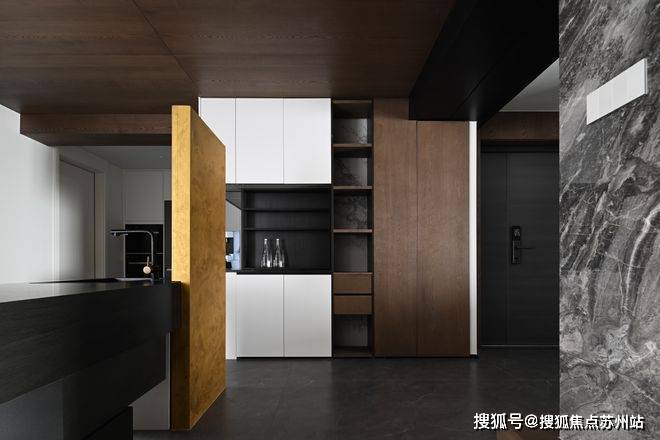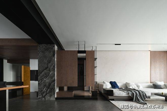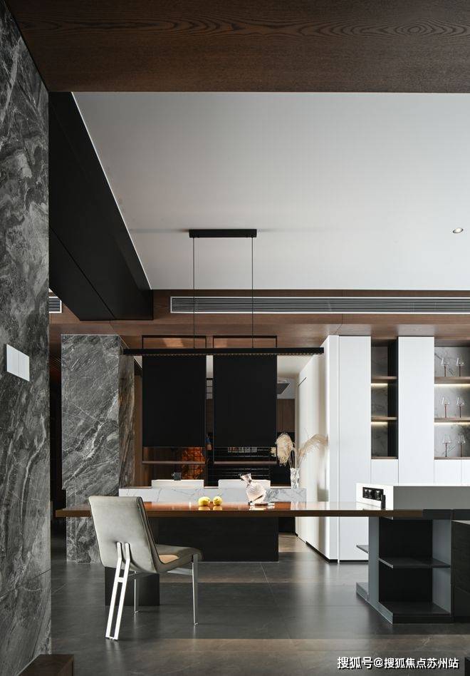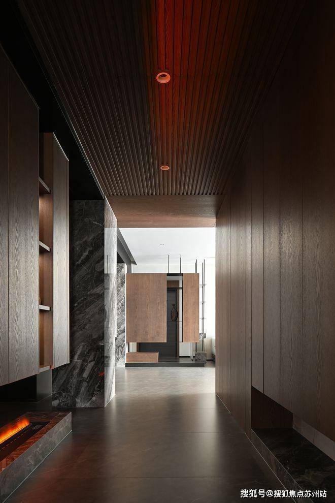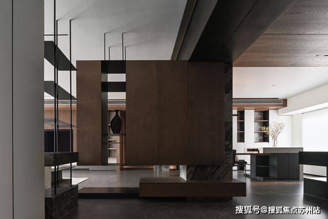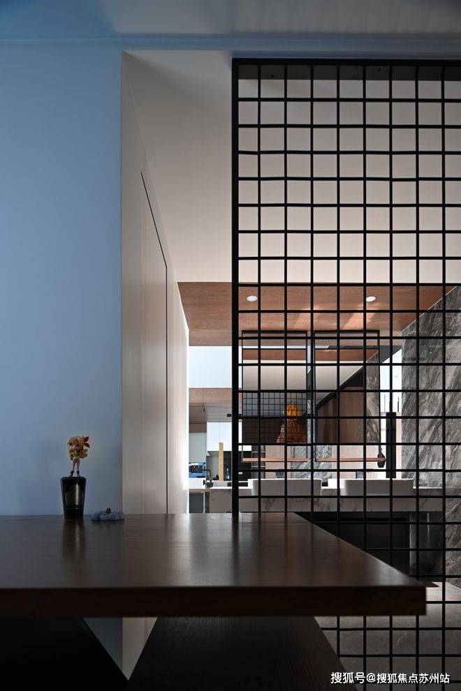 克制的材质使用和通顶的隐形门让走廊维持着外在的简约,格栅的肌理和大理石的纹路交织,悬挑和挖空带来错落的结构感,都丰富着空间的细节和层次。