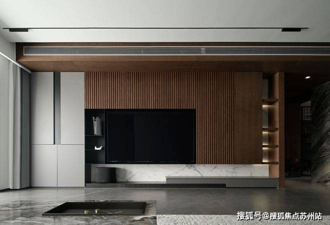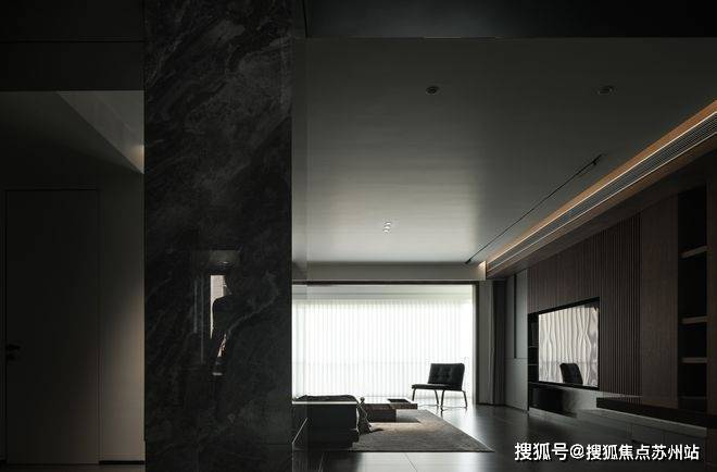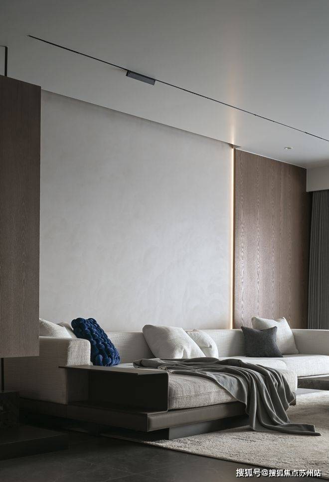木质护墙板和柔和的线灯中和掉空间的冷硬,将温和舒适的气息注入客厅。