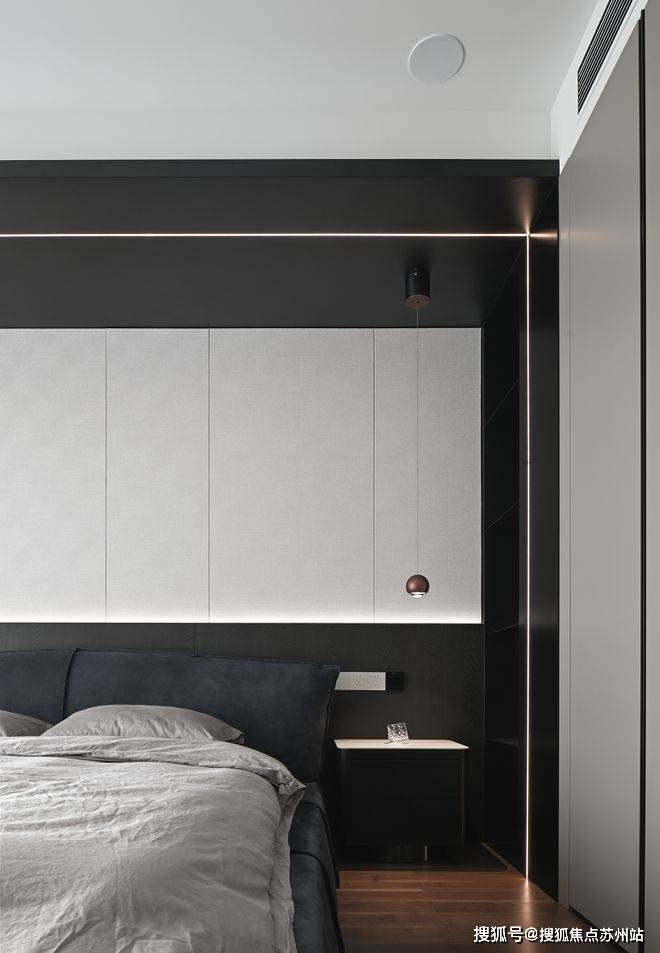 黑白两色描绘的空间理性而平静,木质和皮质展现出睡眠空间舒适的一面。无论是视觉还是触感,都让人沉浸在安稳的情绪里。