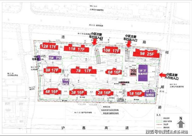 其中1号楼靠近17层的保障房,5号口为3层的配套用房;14#、15#为P站,16#为垃圾用房。