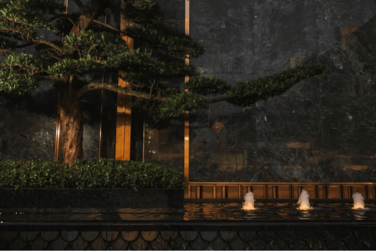 「笔墨门庭」处,宽约58米恢宏主入口,以酒店式落客空间迎宾,彰显归家的尊崇感。形似莲花的聚宝盆水景静卧其中,盆景罗汉松、黑松与蓝钻奢石景墙相映成趣,刚柔并济,寄托福泽绵长的美好寓意。