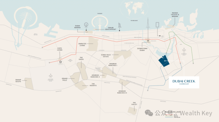 DubaiCreekHarbour(迪拜云溪港)位于迪拜河TheCreek沿岸,是由迪拜最大开发商Emaar在迪拜河畔开发的集住宅购物娱乐及商业办公为一体的综合区域,740万平方米住宅空间和50万平方米公园汇集于此,您可以在这里自由地漫步,感受柔软湿润的空气,享受港口美景带来的视觉冲击,也可以在距离项目仅一步之遥的社区综合体中体验世界一流的商业服务!