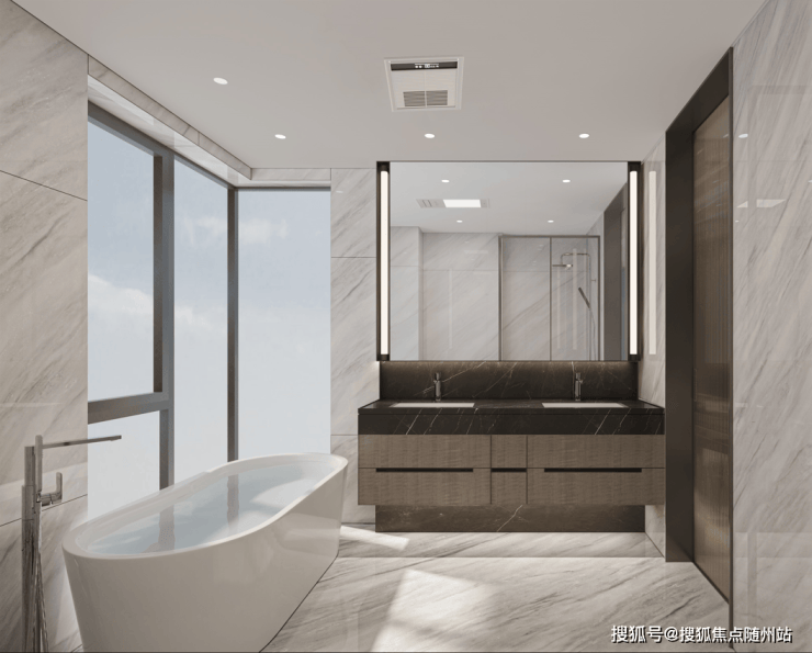 设计的巧思远不止于此,在主卧内部,置入了一线城市大平层户型流行的270°转角景观飘窗,以及双台盆、浴缸等奢华五件套。就连主卧卫生间也配置了270度景观落地玻璃窗,高级感一目了然。
