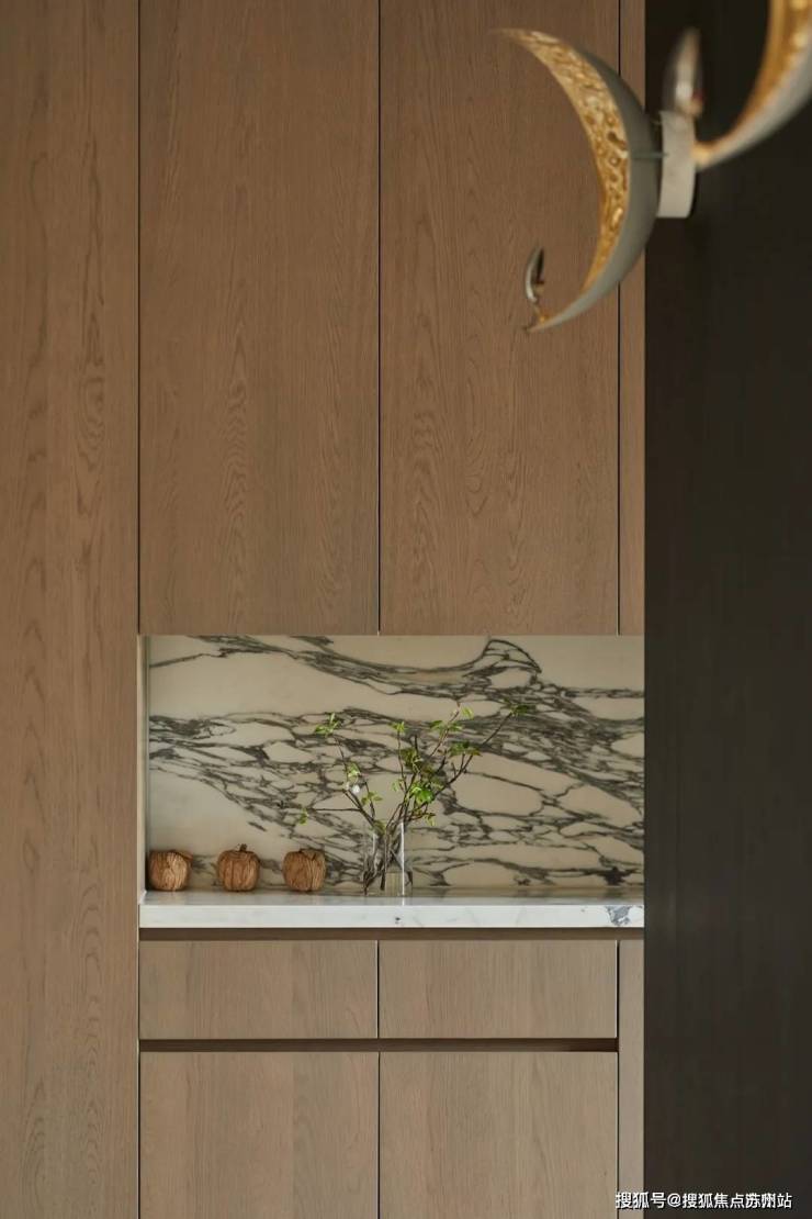改变原结构无玄关的局面,塑造异形隔断,借由轻盈的悬浮造型与古木纹大理石台面形成对比,掀起第一轮视觉惊喜。渐变式格栅,造就出场域的音乐性,花艺与装饰画的意蕴高度契合,表述了居住者的生活态度和追求。