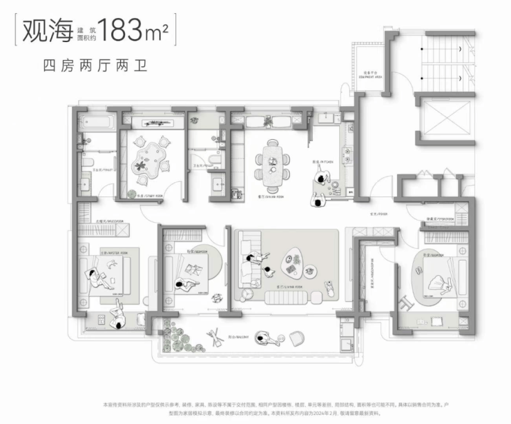 183㎡户型:同样是四房朝南,而且设计了双联阳台,实用又气派。主卧套房配置更奢华,入户还有储藏间,收纳空间规划得非常到位。餐厨一体化的设计,让家人互动更多,更温馨。这两种苏州大平层户型都充分考虑了改善家庭的实际需求。