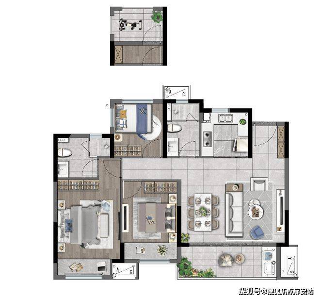 同样三开间朝南,一厅两卧直面阳光。南向双联阳台,不仅满足赏景与家政需求,更是成为丰盛生活的阳光天地。