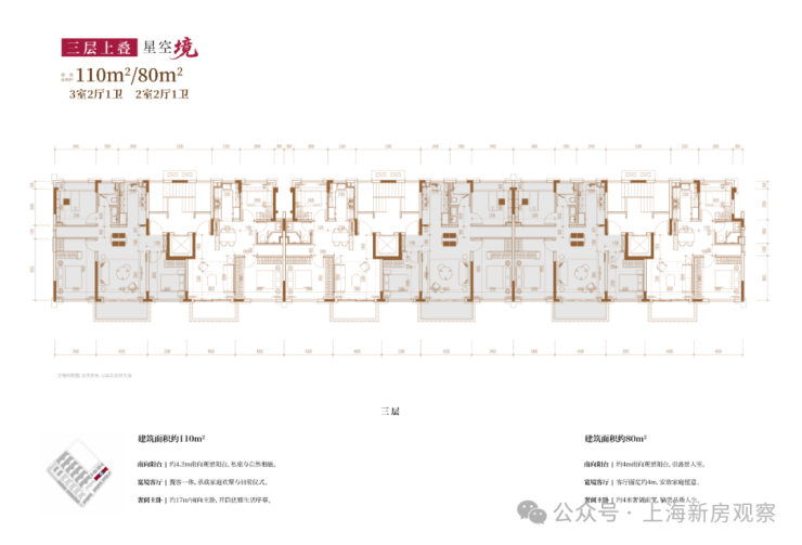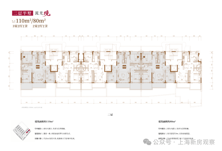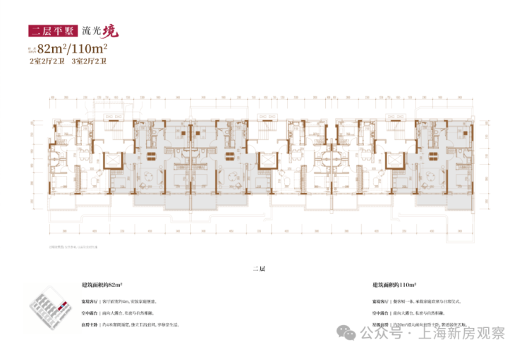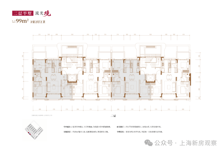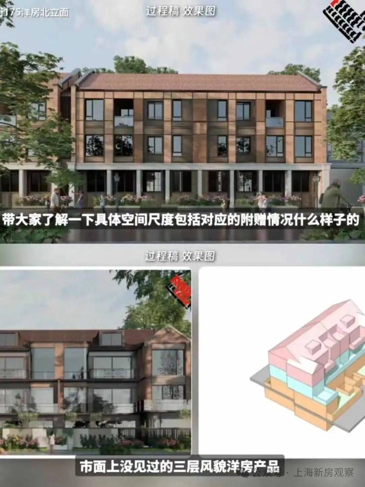 项目主打3层的超低密洋房产品,另有3套联排产品,户型类型丰富;洋房为创新的多层退台式洋房,层高高于传统常规洋房产品,3.3-3.6m层高对标别墅产品层高。