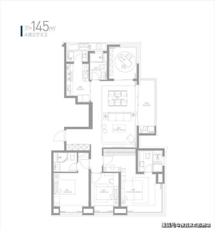 约145㎡四房分布于景观中央位置,可直面一线双水系河景。大横厅搭配270°景观视野,可能是临港主城目前在售户型中,景观视野王者户型。