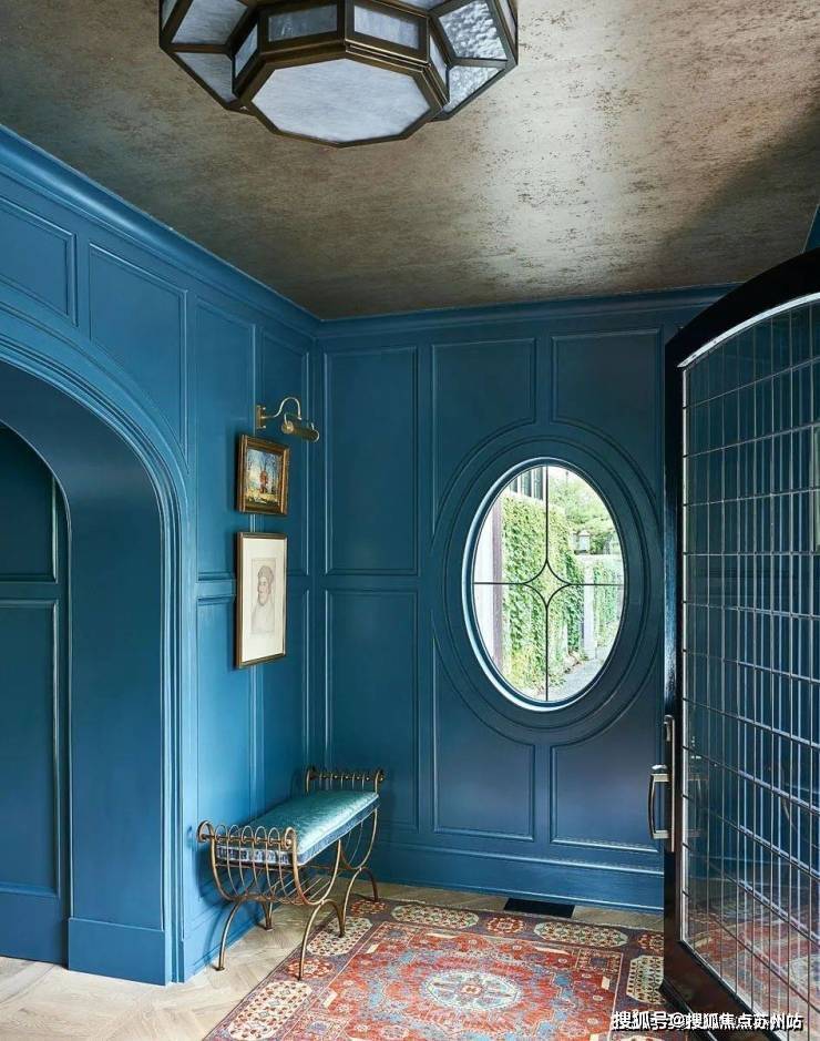 从客厅开始,整个空间都遍布着蓝色的元素,设计师以星座为主题进行设计,搭配上JamesThomas的茶几、HollyHunt的沙发、Minotti的扶手椅和AndriannaShamaris的边桌,打造既高级又充满梦幻感的居家空间。
