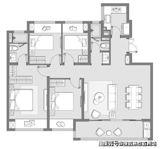 横厅设计,4开间朝南,动静分离;4个房间均带飘窗,赠送面积多。