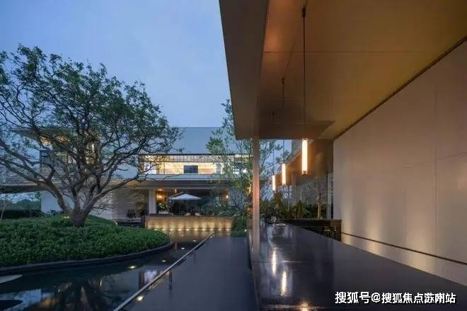 作为花厅拾级而上的又一景点,水吧是观景之地也是休憩之所,落座于精致的吧台,满眼的风景与惬意,天光云影、林木亭廊倒映在水面上,空间变得愈加开阔舒朗。