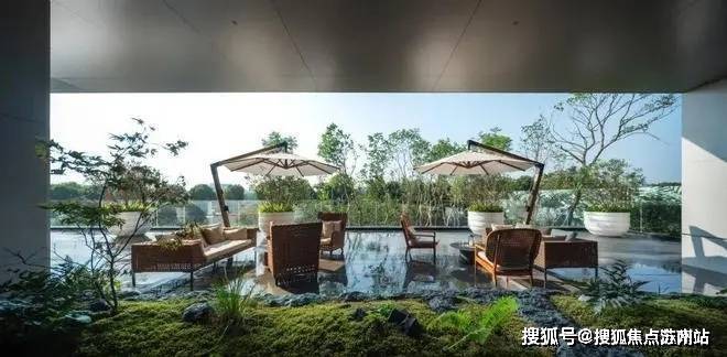 整石雕塑而成的巨型苔藓盆景让空间愈发雅致,精致的花钵栽植了常绿的菲油果树,花香果香磬人心脾,布置舒适宽敞的软装沙发,抬眼望去是一片诗意的乌桕林,于此品茗闲谈,休憩冥想,看云舒云卷,偷得浮生半日闲。