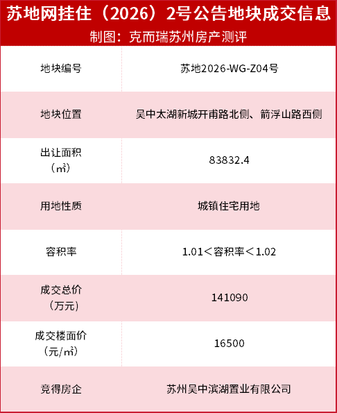 该地位于吴中太湖新城开甫路北侧、箭浮山路西侧,出让面积83832.4㎡,最大容积率1.02,总价141090万元,楼面价16500元/㎡。