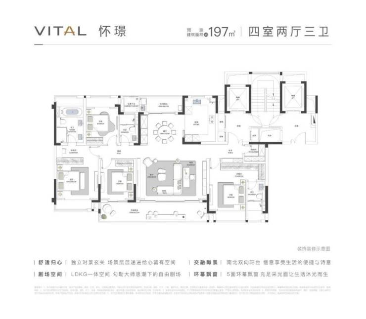 户型鉴赏:纯粹改善,尺度感十足 ● 约170㎡四房:功能齐全,布局方正。 ● 约197㎡四房:空间阔绰,居住升级。 ● 约230㎡四房:奢阔大平层,终极改善之选。