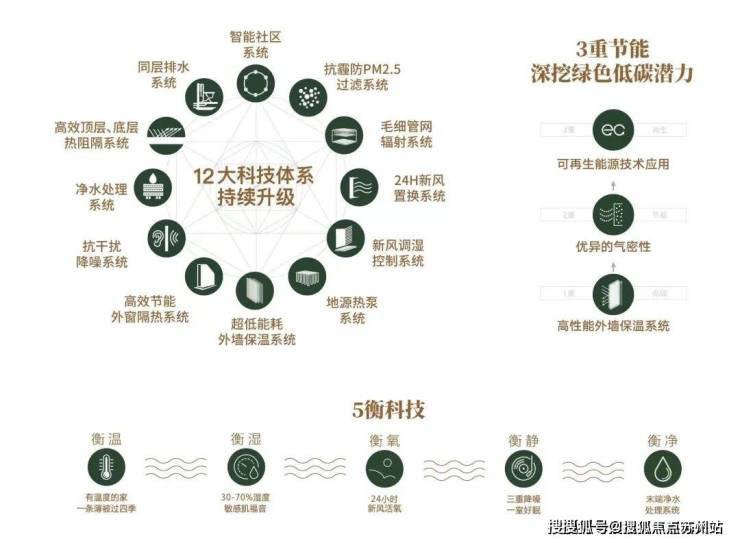 围绕阳光、水、温度、湿度、声音、空气六大环境要素,构建的12大科技系统,带来全面领先于市场的衡温、衡湿、衡氧、衡静、衡净五衡居住体验,打造更适合中国人的健康智慧科技社区。