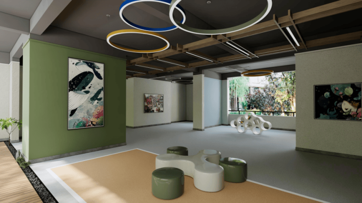架空景观,无界社区 小区设计很有巧思,一楼做了大面积的架空层,里面规划了儿童活动区、健身区、休闲区等,不管刮风下雨,老人小孩都有丰富的活动空间。整个社区的园林景观也经过精心设计,归家路上处处是风景。 ▲ 湖西银座丨架空层效果图