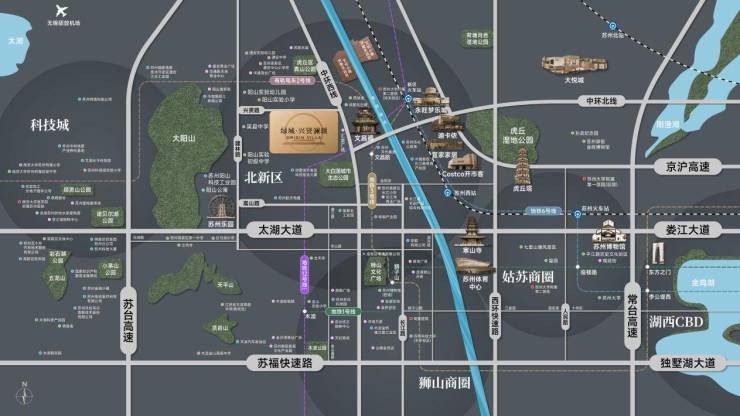 交通便捷:立体路网,畅达全城。周边环绕高新区高架桥、中环西线/北线、太湖大道高架路“3高架”,以及苏台、沪常、京沪“3高速”。约2.4公里(10分钟车程)即达新区高铁站,约17公里(30分钟)可到苏南硕放机场,出行非常高效。