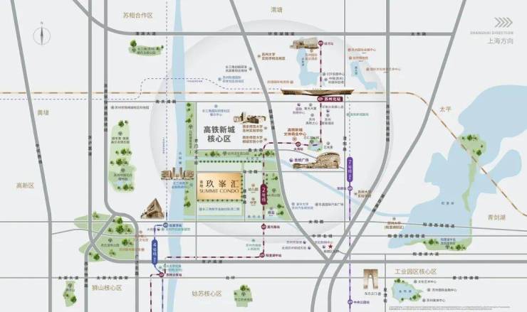 4. 医疗 & 生态:高铁新城医院、苏州妇幼保健院相城院区;北河泾生态体育公园、大湾公园、中国花卉植物园环绕。
