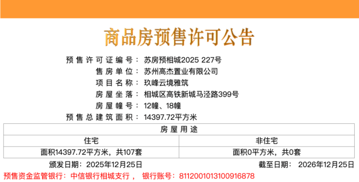 就在今天(12月26日),高铁新城南部片区的核心地块——金地玖峯汇正式领取预售许可证!这个由苏州高铁国控+江西建工+金地管理联合打造的低密四代宅,不仅拿地时就备受关注,如今以约3万/㎡的价格入市,更是让改善客群眼前一亮。