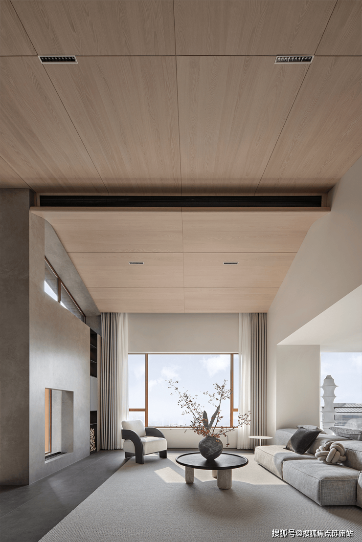 两面式沙发,打造出更随意的坐卧选择与舒适体验。木质吊顶铺展延伸,层次错落有致,仿若将室外的自然意境延伸到了屋内,简雅质朴而温润有加。