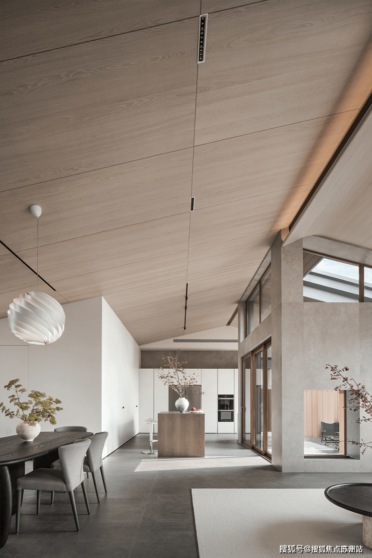 原有西厨空间背后距离室外的高层太近,设计师将其格局进行重新梳理,对其进行了退后处理,把餐厅打造成了一个独具造景关系的私密生态空间。
