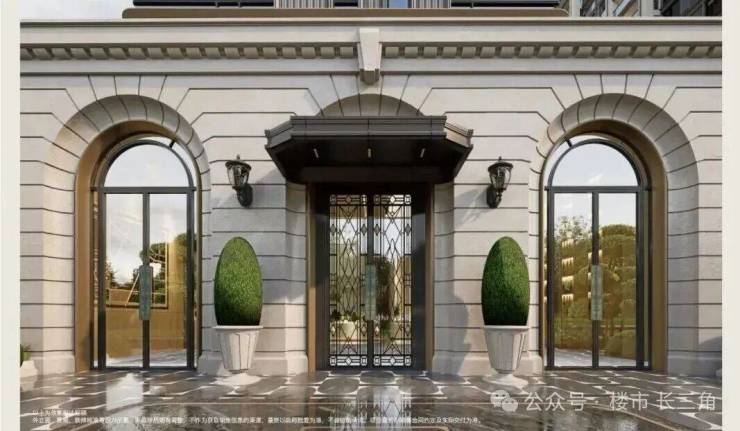 首先,项目西侧人行主入口大门,采用经典的拱券序列符号,以浅色石材、咖色金属与玻璃的精致搭配,营造出复古奢华的归家仪式!