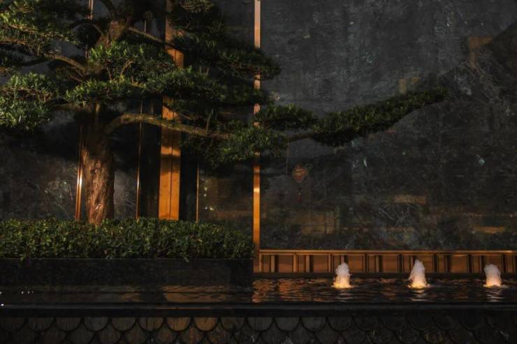 「笔墨门庭」处,宽约58米恢宏主入口,以酒店式落客空间迎宾,彰显归家的尊崇感。形似莲花的聚宝盆水景静卧其中,盆景罗汉松、黑松与蓝钻奢石景墙相映成趣,刚柔并济,寄托福泽绵长的美好寓意。