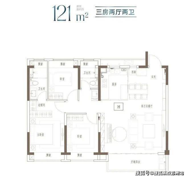 户型特点:3开间朝南,全屋阳光充足;L型厨房转角移门设计,最大化空间视野;四飘窗设计,通透空间享受;动静分区,亲密有度;套房式主卧,容纳私谧生活点滴;