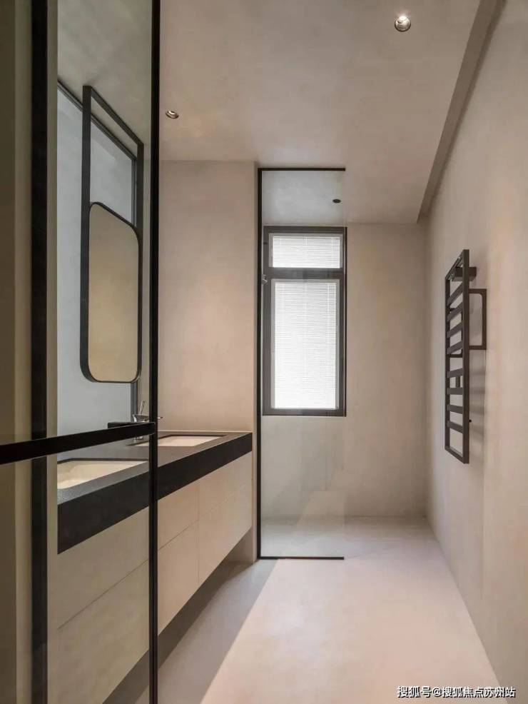 近活动室一侧安装洗手池,上方定制满墙浴室镜,增加视野明亮度,单人台盆有颜值且方便使用,左手边为原洗手间区域,让渡一部分空间给走道后,打造为马桶及淋浴区,实现干湿分离,功能齐全且合理利用空间。