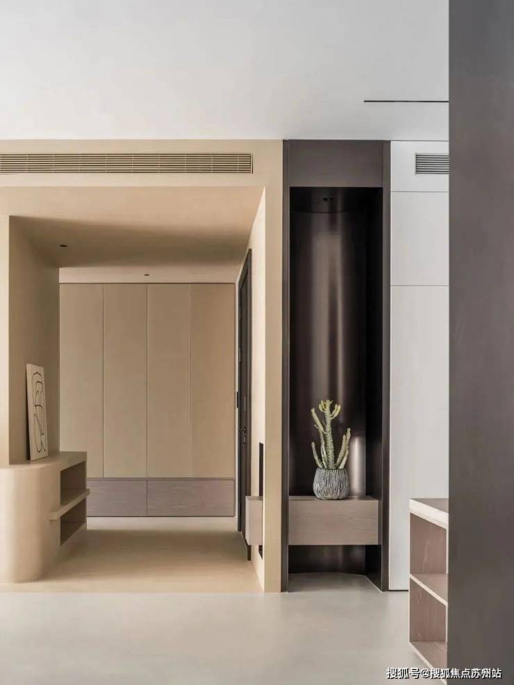 玄关与客厅之间采用不同色调微水泥,以视觉划分区域,形成空间感,同时于玄关处吊顶,藏起空调及各类管道,不影响客餐厅等高频率活动区域的层高视野,隐形加长出风口延伸至与墙面同宽,同吊顶融合一体,降低视觉存在感,更显简练。