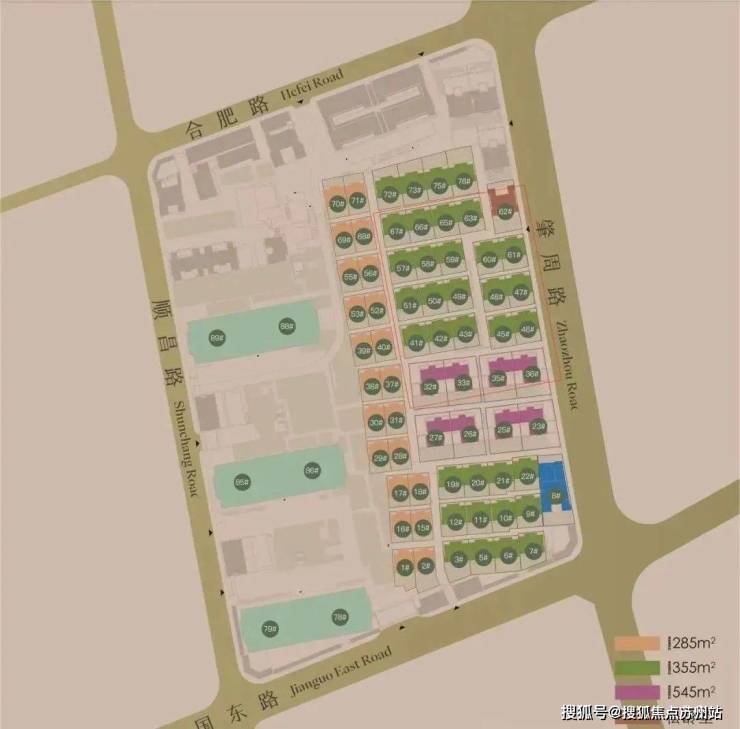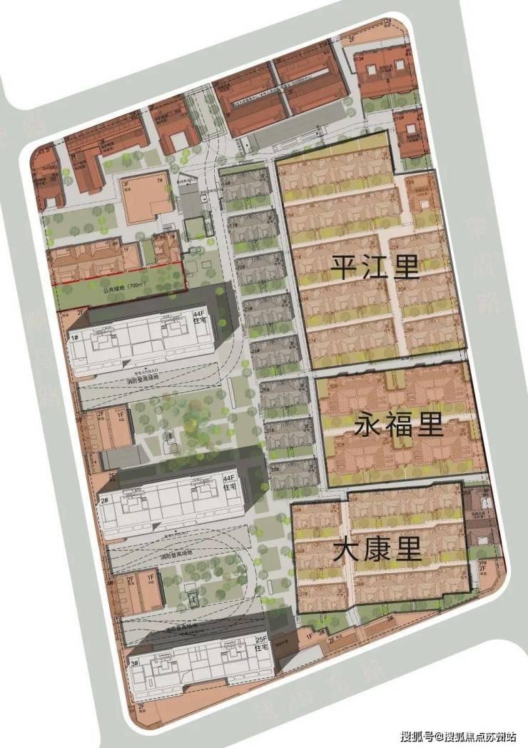 实景图中海·顺昌玖里秉持“传承革新”的地脉文化精神,在片区的城市更新中,遵循土地的演进脉络和肌理,保留了地块当中原有的平江里、大康里、永福里三大组团格局,参照留存下来的地图文志资料,梳理还原出地块内部3大组团、2条竖向主弄、9条横向支弄的城市肌理格局。