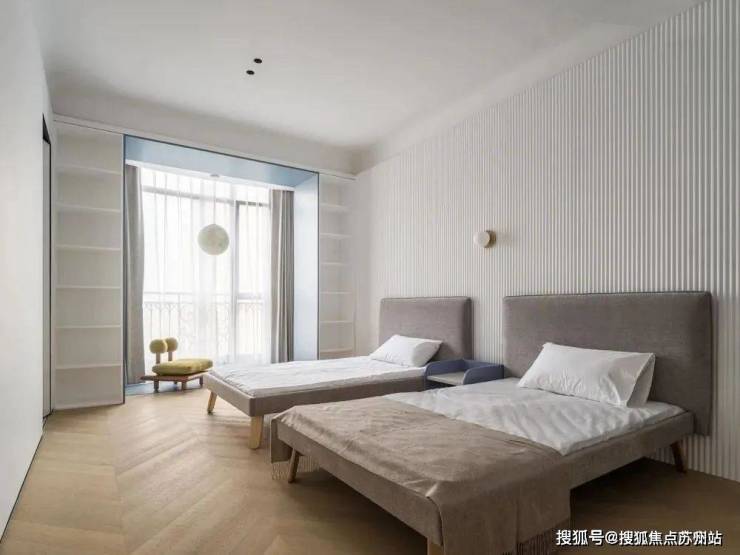 儿童房为两个孩子的房间,一房两床更易于度假期间培养孩子感情。利用阳台两侧承重墙体留出的深度差,定制通高收纳柜,开放格丰富储物容量。背景墙以通高长城板做出层次,同墙面及吊顶一致的纯白色调,让其视觉效果丰富却不杂乱。