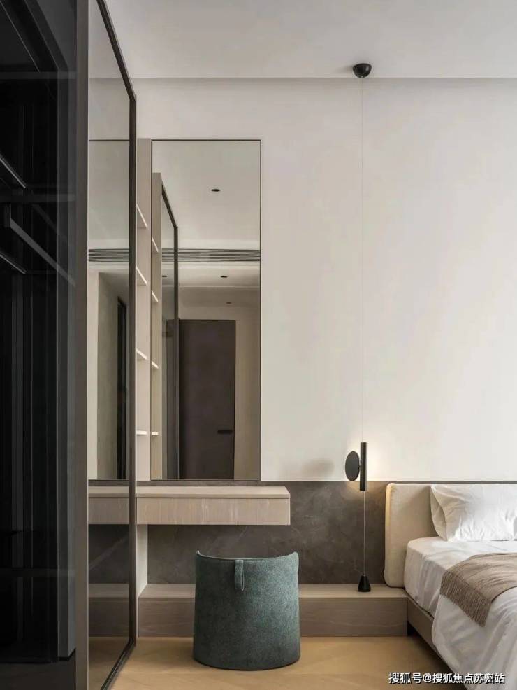 定制悬浮床,与床头一体化设计,轻盈美观。左侧定制悬空桌面,抽屉设计增添储物功能,上方安装高挑全身镜,增加视觉纵深感及空间采光,也方便女屋主梳洗化妆,侧面依据衣柜进深,定制嵌入式壁龛柜,多层储物格,满足收纳需求,合理利用空间,做到美观与实用性兼得。