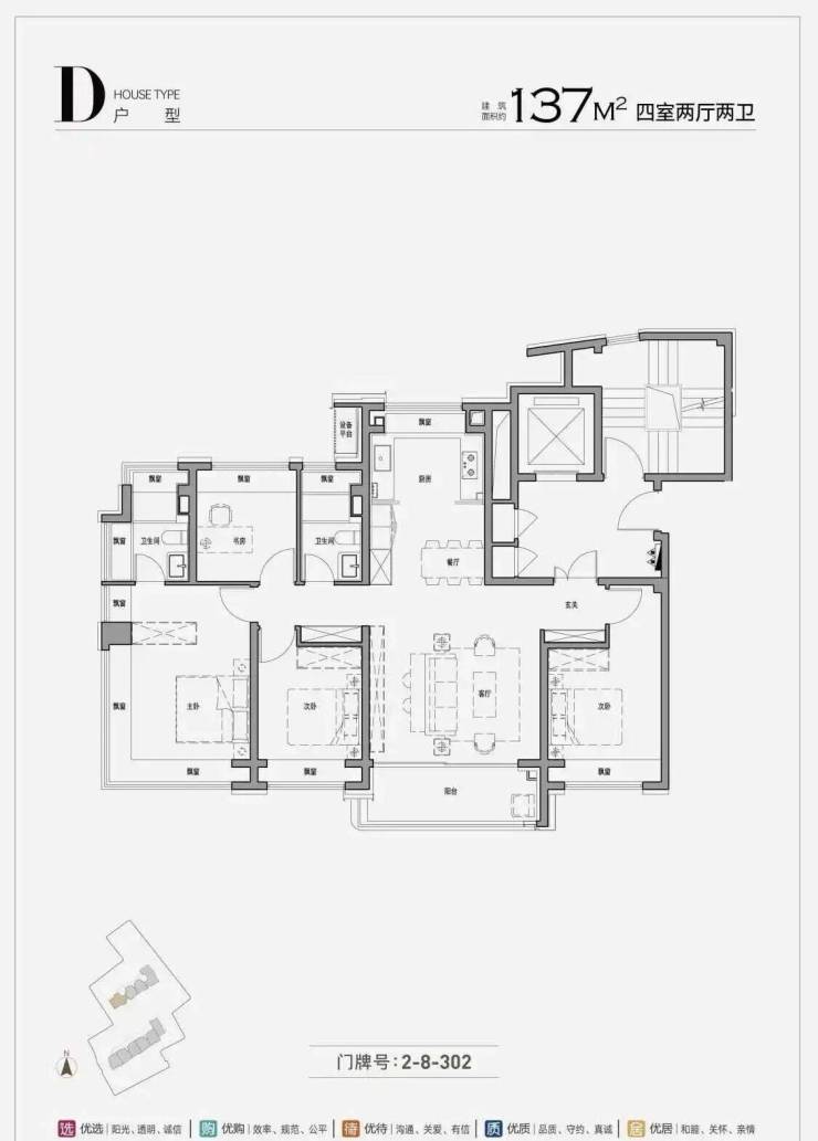 约137㎡四房两厅三卫:高端改善顶配户型,稀缺性十足,适配追求高品质生活的高端家庭.户型方正通透,南北双阳台设计,采光通风俱佳,270°全玻璃幕墙转角飘窗,拓宽视野边界,彰显居住格调;客餐厅开阔大气,可满足大型家庭聚餐、商务宴请等需求;主卧豪华套房设计,配备独立卫浴、衣帽间与休闲飘窗,私密性与舒适度拉满,两个次卧均配备独立卫浴,兼顾家人居住私密性,书房空间宽敞,可作为办公、阅读或休闲空间,全方位满足高端家庭的居住需求,彰显圈层质感.